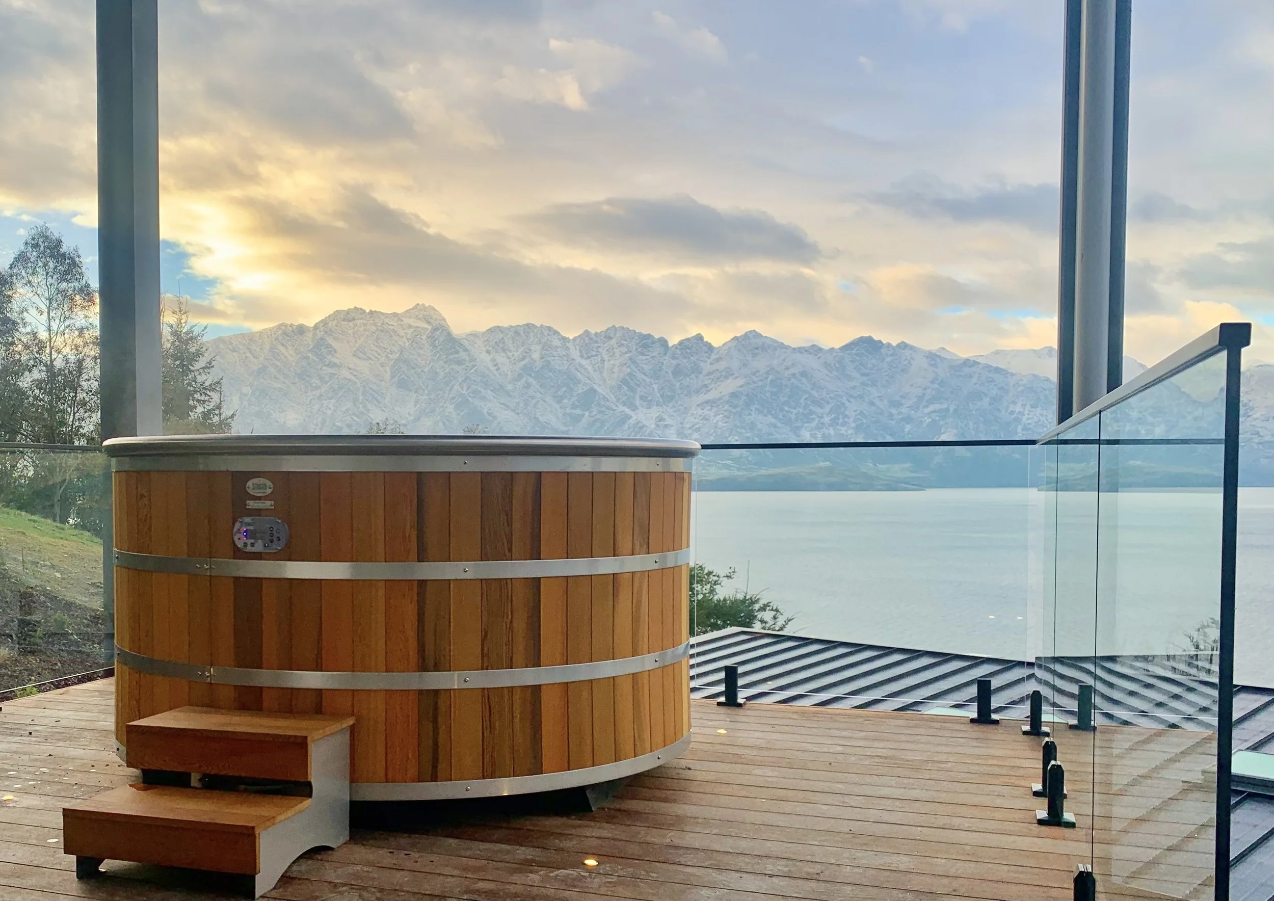 Nestled amidst nature's paradise, our Stoked cedar and stainless steel spa pools offer the ultimate relaxation experience, perfectly positioned to overlook the majestic waters of Lake Whakatipu and the iconic Remarkable Mountain Range.